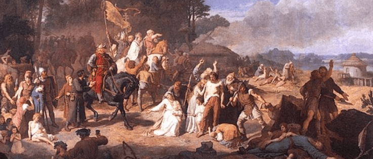 Hermann turn to strike with horse units. He has 4 mounted units. 2 Knights (2 hits each) and 2 Sergeants (1 Hit each) + he has the Field Organ Arts-of-War card that adds +1 hits for each of his Knights and Sergeant units on round 1. This totals out to a whopping 10 hits from Hermann’s mounted units. The Russian will start by taking the hits on his Sergeant Unit. The rolls are 3, then 5. The 5 is too high and the Sergeant is routed, 8 hits to go. The Russian will start taking the hits on his 2 Men-at-Arms units. The dice come up 3, 4, 1, and 6. The 4 and 6 are too high and the Men-at-Arms units both route. The light horse is the last Russian unit left with 4 hits to go. The Russian will need a miracle to survive. The rolls are 1, 1 and 3. It is the second to last hit that routes the resilient Russian light horse. The battle ends with a Teutonic victory.