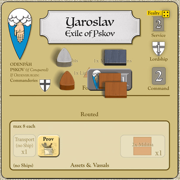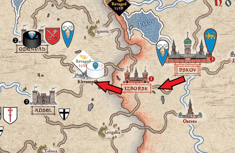 Hermann has 2 nearby supply sources and 2 boats. He can use the supply command to gain up to 2 provender, 1 from each supply source. He is at his home location Dorpat which is one of his supply sources (it shares his heraldry) therefore no transportation is needed to gain the first provender. He has a second adjacent supply source at Odenpah. This is connected by a waterway so Hermann can use boats to transport the second provender. Herman gains the needed 2 provender with just 1 command. He uses his last 2 commands to march and intercept Vladislav at Jerwen which triggers combat.